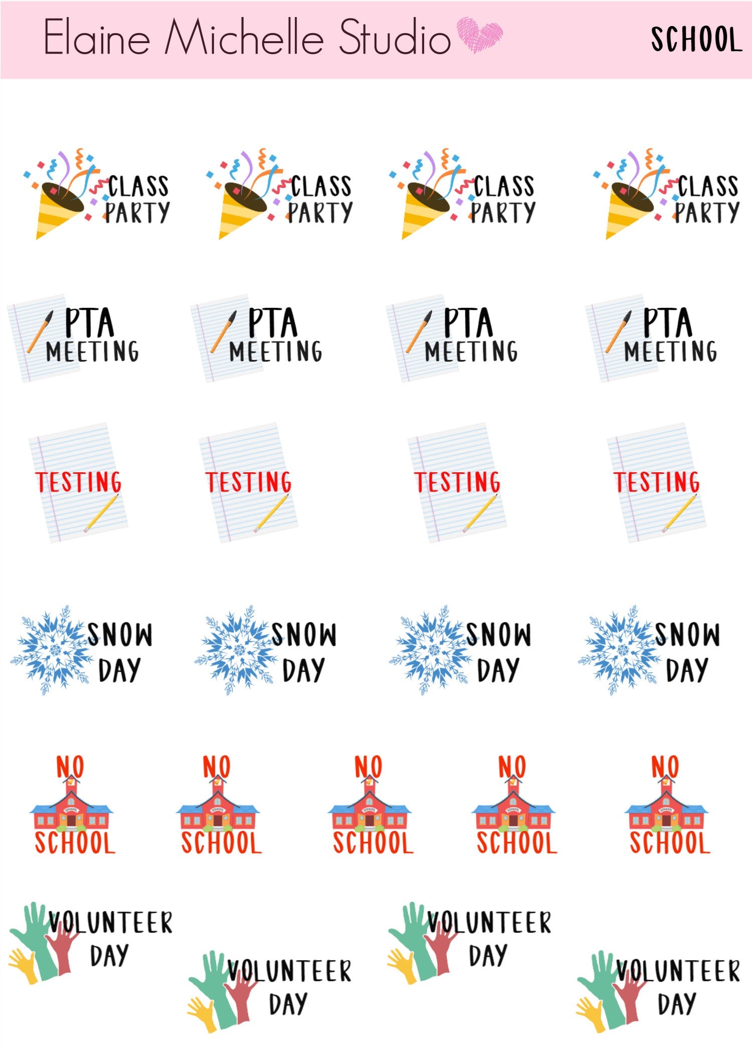 Stickers included: Report Card, Field Trip, Early Dismissal, Parent Teacher Conference, Fall Break, Winter Break, Spring Break, Awards assembly, Science Fair, Bake Sale, Class Party, Teacher Appreciation, Picture Day, Book Fair, No School, PTA Meeting, School Play, Art Fair, School Concert, Volunteer Day, Testing, Field Day, breakfast events, Graduation, and Snow Day
